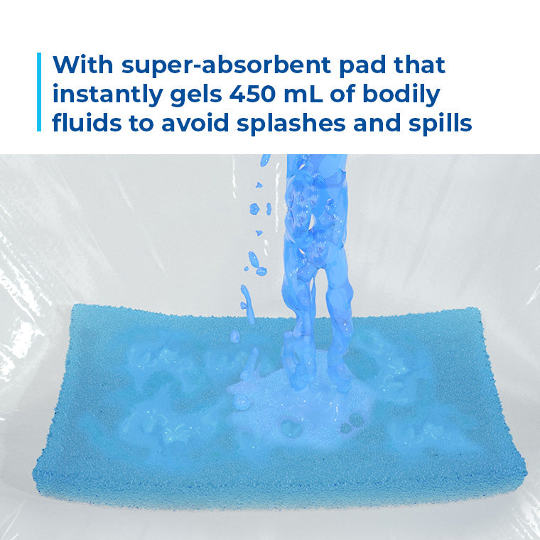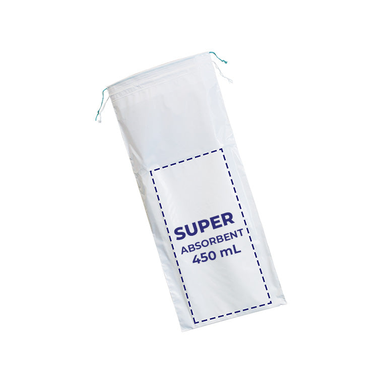 Medical grade bag equipped with a unique super absorbent pad which turns up to 16oz of urine into a gel within seconds